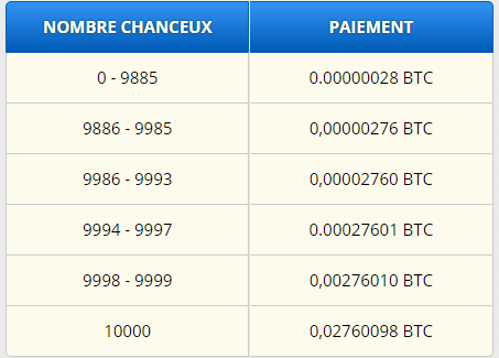 Le montant de bitcoins que vous pouvez gagner avec BTC GRATUIT dépend du prix actuel du bitcoin et le plus gros prix est fixé à 200 $ US et les autres prix en proportion. Ainsi, lorsque le prix d’un bitcoin baisse, le montant de la récompense calculé en bitcoins augmente et l’inverse est également vrai. Donc, quel que soit le prix actuel du bitcoin, vous avez une bonne chance de gagner 200 $ US en bitcoins à chaque rouleau.