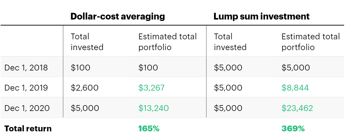 Supposons maintenant que vous ayez attendu un an et investi 200 $ en bitcoin chaque mois entre décembre 2018 et décembre 2020. Dans ce cas, votre portefeuille totaliserait un peu plus de 13 000 $ en 2020, contre 23 000 $ pour un investissement forfaitaire. Cet investissement « tout compris » vous aurait rapporté un profit plus élevé, mais il aurait également été plus risqué : tout mouvement de prix important après votre date d’investissement initial aurait affecté l’ensemble de votre investissement.