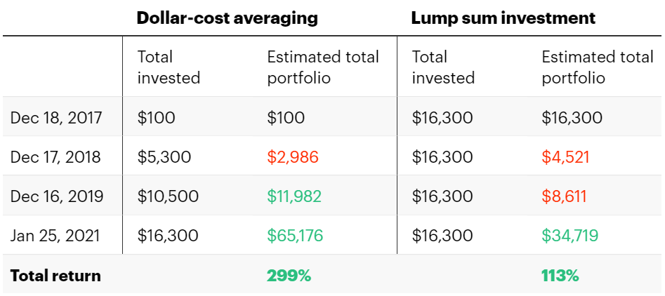 Si vous aviez investi 100 $ en bitcoin chaque semaine à partir du 18 décembre 2017 (près du pic de prix de cette année-là), vous auriez investi un total de 16 300 $. Mais le 25 janvier 2021, votre portefeuille vaudrait environ 65 000 $, soit un retour sur investissement de plus de 299 %.