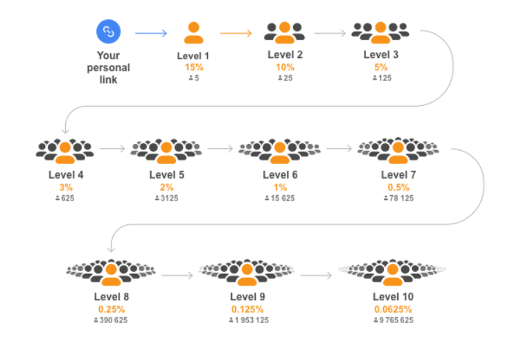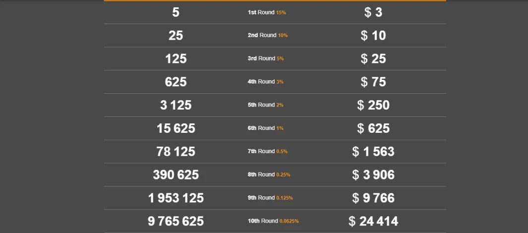 Voici un calcul simple sur combien vous pouvez gagner chaque mois si vous parrainez 5 personnes qui font également référence au même numéro et si cela continue jusqu’au niveau 10.
